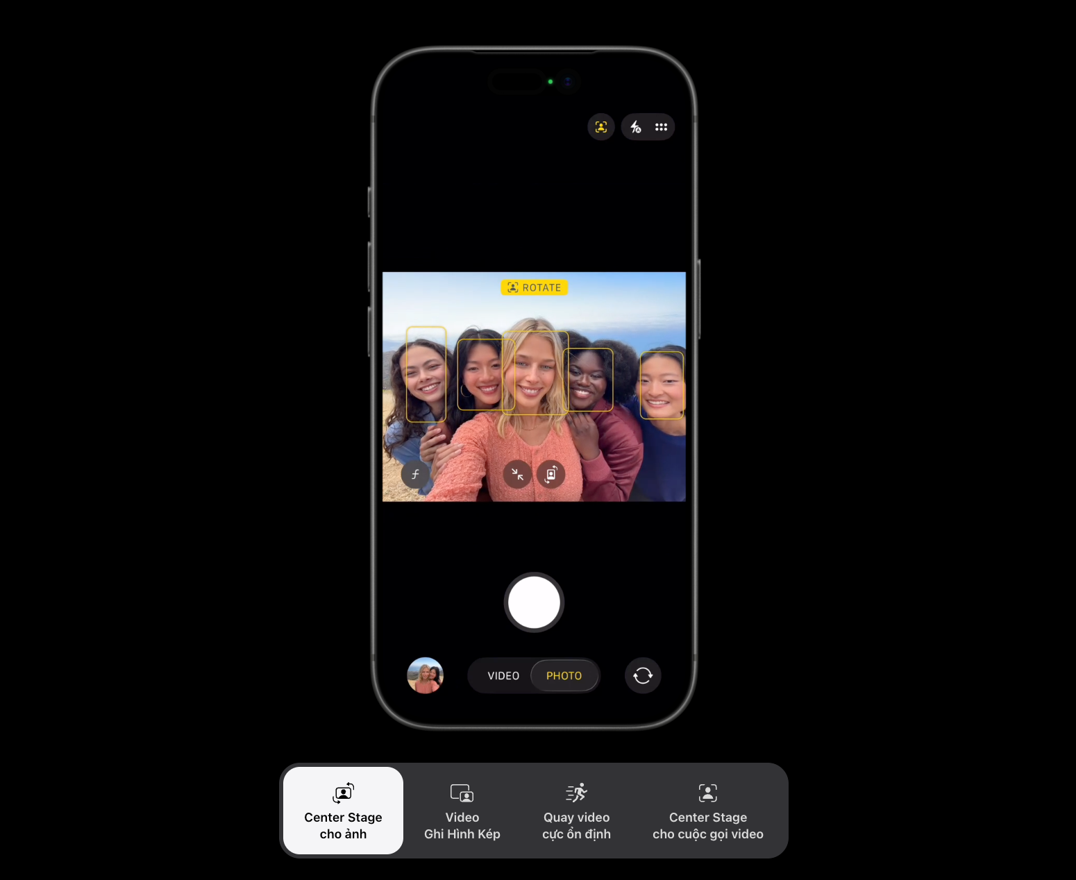 Apple còn bổ sung Genlock – cho phép đồng bộ nhiều camera khung hình theo khung hình, lần đầu tiên xuất hiện trên iPhone. Camera trước mới mang đến cho bạn những cách linh hoạt để căn chỉnh khung hình khi chụp ảnh và quay video – và hơn thế nữa. Chạm để mở rộng trường ảnh và xoay từ khung hình dọc sang khung hình ngang mà không cần di chuyển iPhone. Và khi bạn bè góp mặt vào khung hình, trường ảnh sẽ mở rộng để ghi hình được nhiều người hơn trong ảnh selfie.