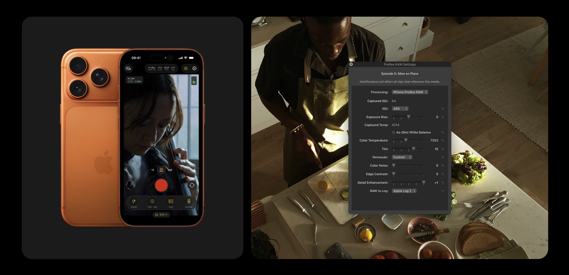 Các tính năng quay phim đạt chuẩn chuyên nghiệp gồm Dolby Vision HDR, ProRes RAW, ProRes Log và hỗ trợ ACES. Apple còn bổ sung Genlock – cho phép đồng bộ nhiều camera khung hình theo khung hình, lần đầu tiên xuất hiện trên iPhone.